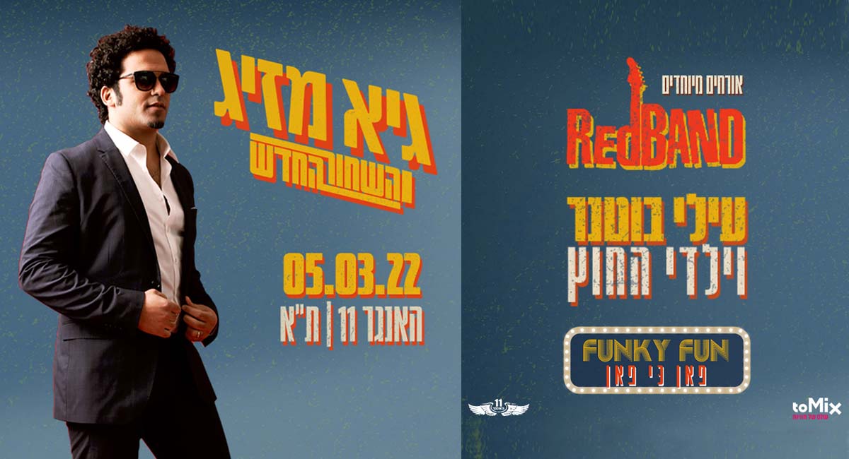 גיא מזיג – Funky Fun גיא מזיג, נסיך הגרוב ומלך הפאנק! הגרסה הישראלית שלנו ל Bruno mars ו Anderson paak מגיע בפעם הראשונה לבמת ההאנגר 11 עם הרכב מורחב ואורחים מיוחדים. מופע הגרוב מלא ההומור של מזיג כבר…