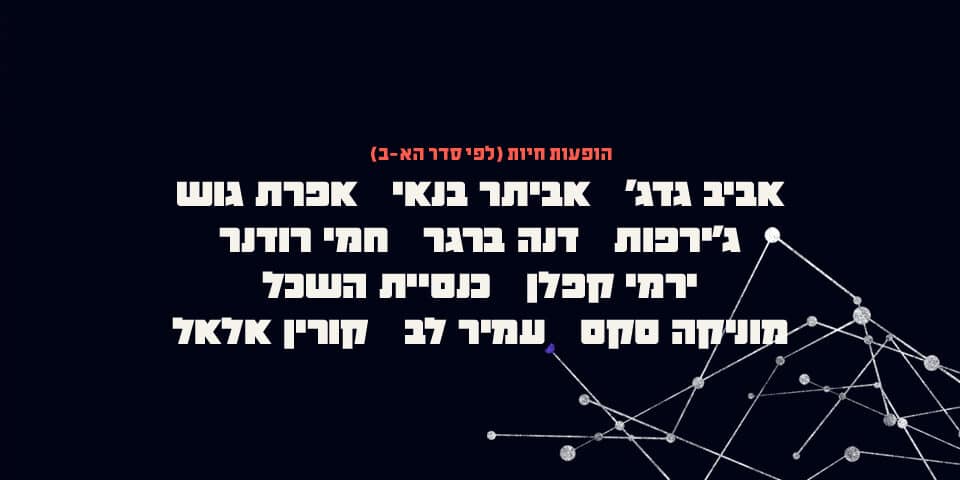 אביב גדג’, אביתר בנאי, אפרת גוש, ג’ירפות, דנה ברגר, חמי רודנר, ירמי קפלן, כנסיית השכל, מוניקה סקס, עמיר לב, קורין אלאל.